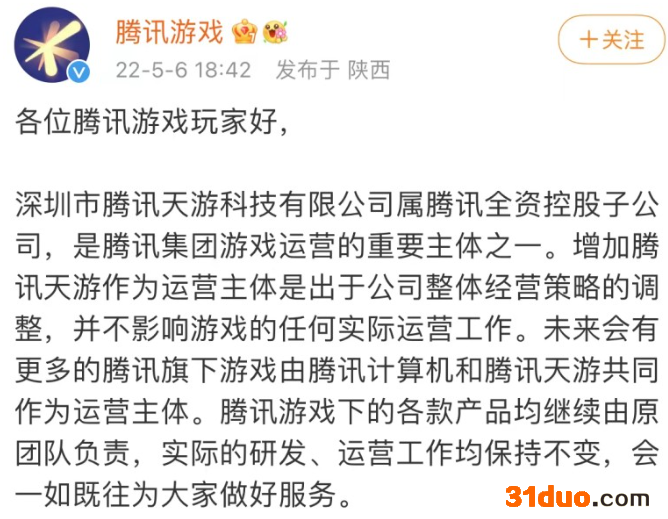 蓝鲸TMT频道5月6日讯,腾讯游戏在其官方微博表示,增加腾讯天游作为运营主体是出于公司整体经营策略的调整,并不影响游戏的任何实际运营工作。