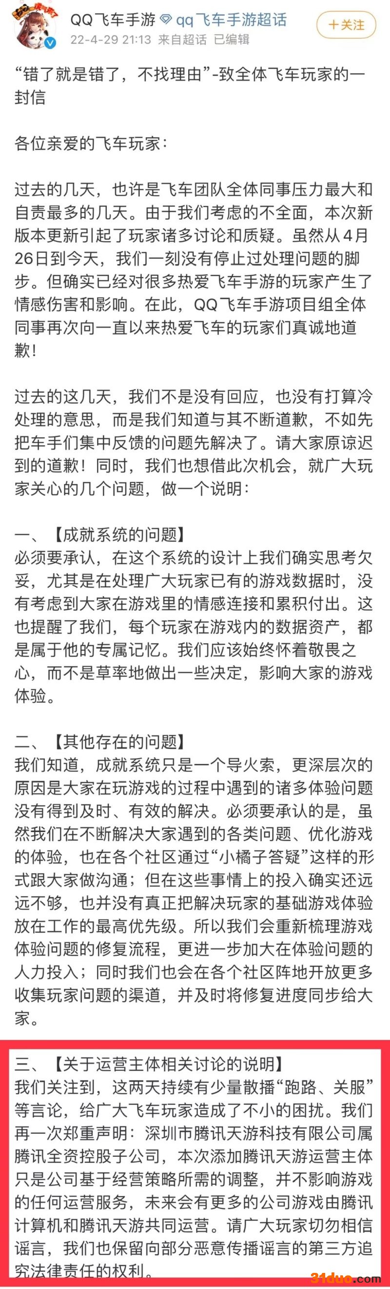 此前4月29日,《QQ飞车手游》对新版本更新后玩家成就数据被清空进行道歉,并声明称:深圳市腾讯天游科技有限公司属腾讯全资控股子公司,本次添加腾讯天游运营主体只是公司基于经营策略所需的调整,并不影响游戏的任何运营服务,未来会有更多的公司游戏由腾讯计算机和腾讯天游共同运营。