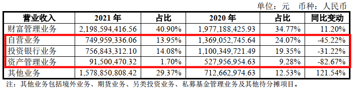 东兴证券2021年营业收入的下滑,与主要业务的表现不佳有关。除财富管理业务收入同比增长11.20%外,主要业务中的自营、投资银行和资产管理业务同比分别下滑45.22%、31.22%和82.67%。