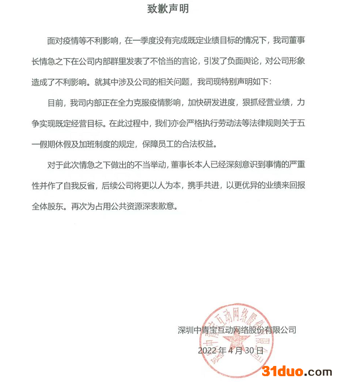 据媒体报道,“五一”节前网上传出中青宝公司内部聊天记录,李瑞杰强制要求员工五一假期加班,并表示“五一全部加班”“不服的,马上炒掉”。中青宝之后还在其公众号上发表了致歉声明。
