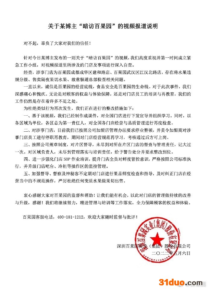 中国网财经5月7日讯 (记者 钟文鑫)针对某博主发布的暗访百果园的视频报道,5月7日凌晨,百果园官方微博发布致歉声明。经查涉事门店为百果园成都两门店,存在将水果违规分级、售卖隔夜果切水果、故意躲避总部检查相关问题。为杜绝类似行为再次发生,正在进行整改措施。百果园表示,涉事门店已按要求停业整顿,并责令加盟商对涉事门店员工进行停职再教育。