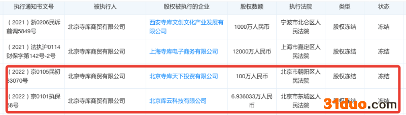 这是今年寺库第二次遭遇股权冻结。今年2月,寺库新增1条数额约6.94万元的股权冻结信息,股权被执行的企业为北京库云科技有限公司,冻结期限自2022年2月23日至2025年2月22日,执行法院为北京市东城区人民法院。