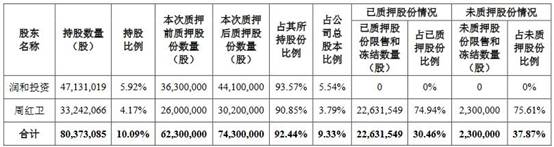 截至公告披露日,润和投资及实际控制人周红卫持股数量合计80,373,085股,本次质押后质押股份数量7430.00万股,占其所持股份的92.44%,占公司总股本的9.33%。