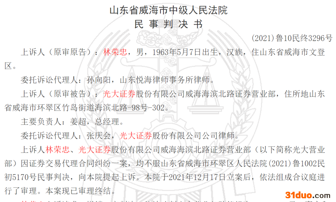 裁判文书网显示,林荣忠与光大证券上述营业部多次沟通,均未达成满意的赔偿结果,且林荣忠投诉至山东证监局,也调解无果。