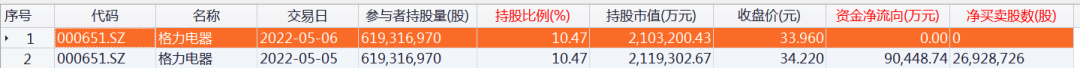 北向资金持股格力电器明细数据