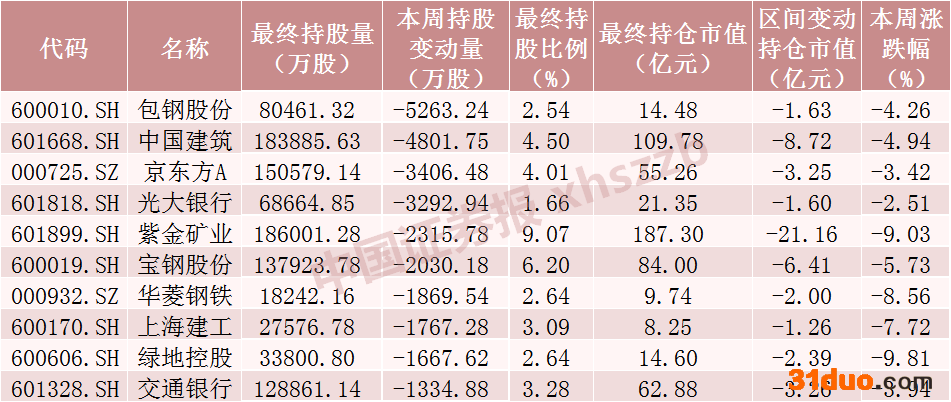 上周北向资金减仓股数前十个股