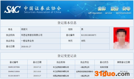 中证协网站显示,李家兴于2018年1月27日在华西证券股份有限公司登记的执业岗位为一般证券业务,目前的登记状态为正常。