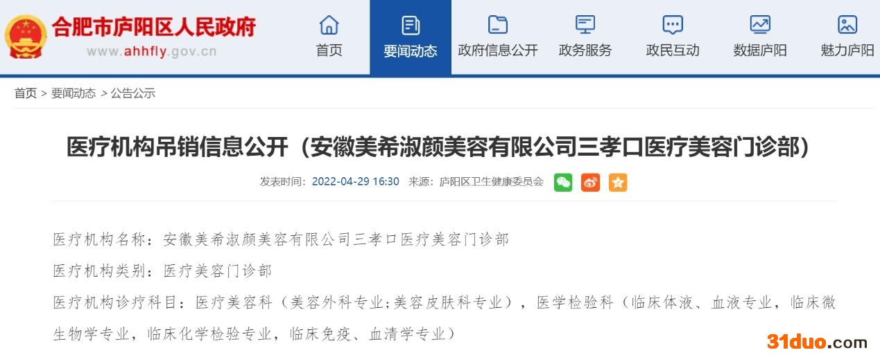中国网财经5月9日讯(记者 段思琦)近日,合肥市庐阳区卫生健康委员会公布一则信息显示,安徽美希淑颜美容有限公司三孝口医疗美容门诊部因诊疗活动超出登记的诊疗科目范围,情节严重,吊销医疗机构执业许可证。