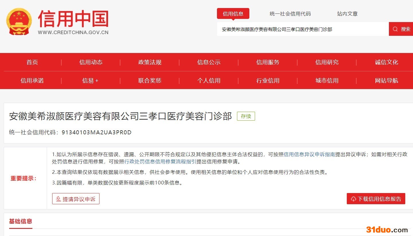 除此之外,信用中国于3月16日披露,安徽美希淑颜美容有限公司三孝口医疗美容门诊部因公示企业信息隐瞒真实情况、弄虚作假的行为,被合肥市庐阳区市场监督管理局列入异常经营名录。