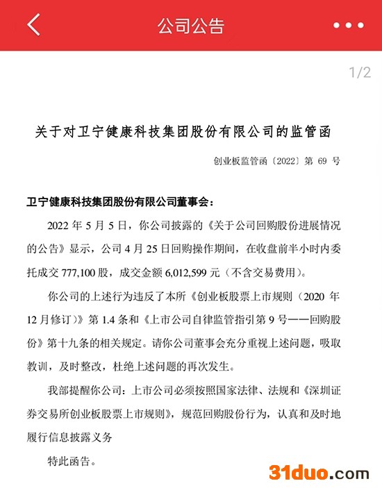 中国网财经5月9日讯(记者 杜丁)今日,卫宁健康科技集团股份有限公司(“卫宁健康”,SZ 300253)因回购股份违规,收到深交所监管函。