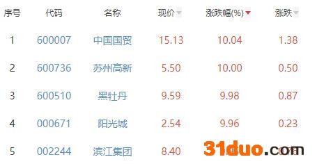 其中,中国国贸、苏州高新、黑牡丹、阳光城、滨江集团列板块涨幅榜前五位,涨幅分别为10.04%、10.00%、9.98%、9.96%、9.95%。