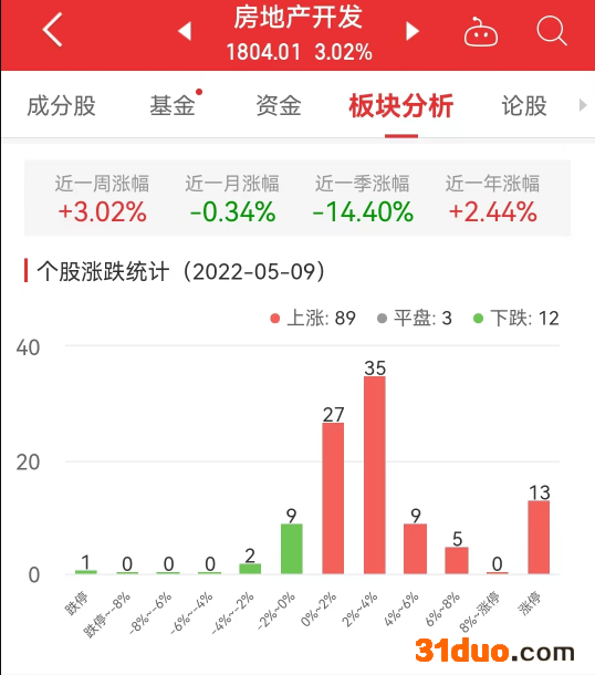 中国经济网北京5月9日讯 今日,房地产开发板块整体涨幅3.02%,其中,89只股票上涨,3只股票平盘,12只股票下跌。