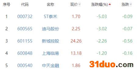 ST泰禾、迪马股份、新城控股、上海临港、中天金融列板块涨幅榜后五位,涨幅分别为-5.03%、-3.02%、-2.26%、-1.20%、-1.06%。