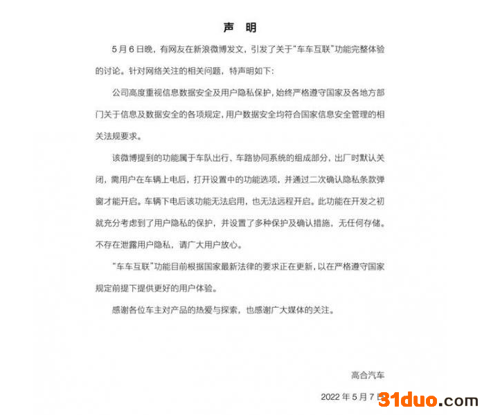 此外,高合汽车还表示:“车车互联”功能目前正根据国家最新法律要求更新,将在严格遵守国家规定前提下为用户提供更好的使用体验。