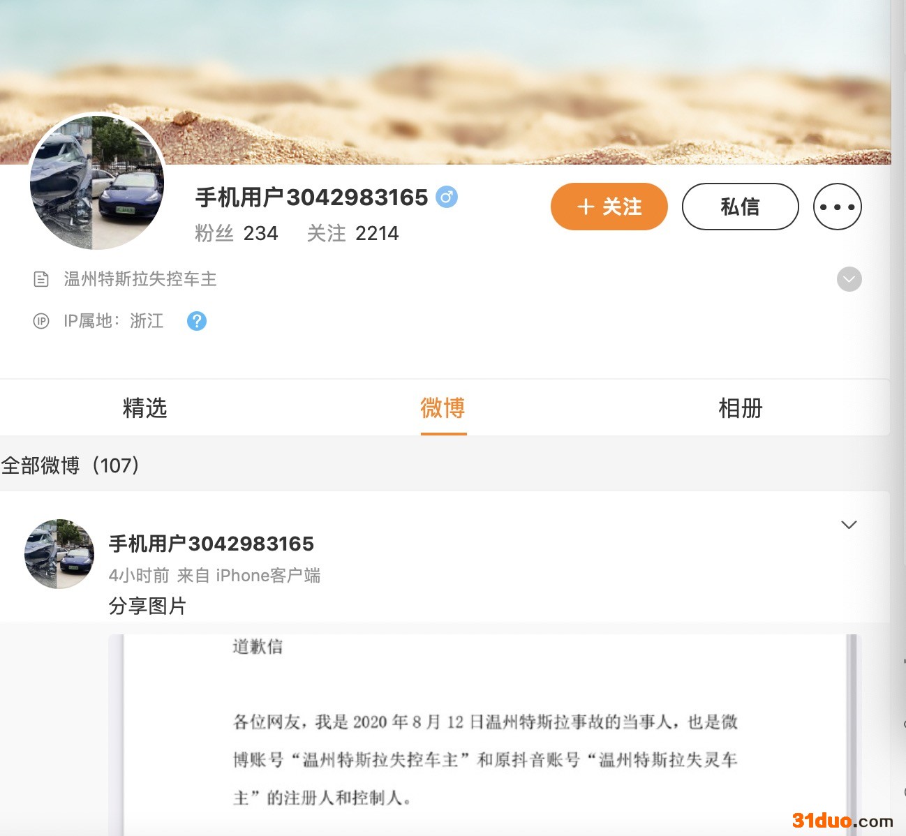 5月9日晚,用户名“手机用户3042983165”、简介为“温州特斯拉失控车主”的微博用户发布道歉信称,事故发生当晚,在驾车回家时突然发现前方有人,想踩一下刹车,结果踩错了油门。他还表示,事故发生后,虽明知自己把油门当作刹车踩了,但因心有不甘,在多个媒体上捏造“特斯拉自动加速刹车失灵”等内容。