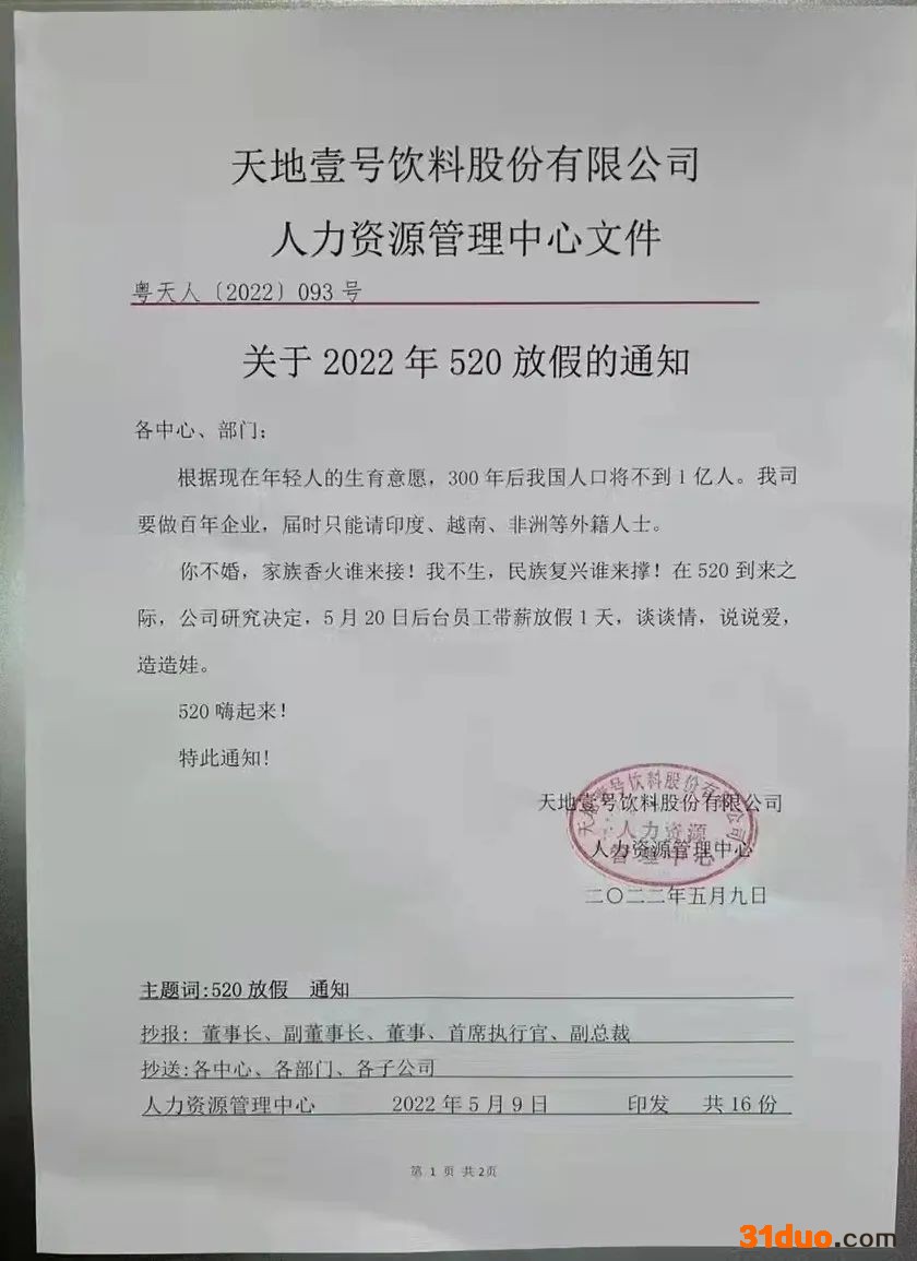 “根据现在年轻人的生育意愿,300年后我国人口将不到1亿人。我司要做百年企业,届时只能请印度、越南、非洲等外籍人士。你不婚,家族香火谁来接!我不生,民族复兴谁来撑!在520到来之际,公司研究决定,5月20日后台员工带薪放假1天,谈谈情,说说爱,造造娃。520嗨起来!特此通知!”该通知的落款显示为天地壹号饮料股份有限公司(简称“天地壹号”),由公司人力资源管理中心5月9日发布。