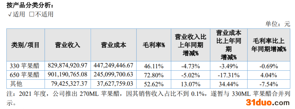目前公司主要产品仍为苹果醋,2021年苹果醋销量占比超90%,其中330ml苹果醋收入8.3亿元,同比下滑了4.73%。650ml苹果醋收入9.01亿元,同比下滑5.02%。以及为了迎合现代社会低糖健康的消费理念,公司还开发并上市270ml的低糖健康易拉罐装陈醋饮料、低糖苹果醋饮料等产品。