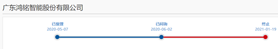 2020年5月,鸿铭股份公布首份科创板IPO申报稿。2021年1月14日,上交所公告显示,鸿铭股份将于2021年1月21日科创板IPO上会。但上交所2021年1月20日的公告显示,因鸿铭股份撤回发行上市申请、东莞证券股份有限公司撤销保荐,根据相关规则规定,上交所已终止鸿铭股份发行上市审核。