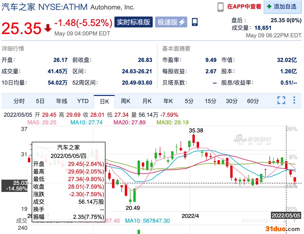 中国经济网北京5月10日讯 截至5月9日美股收盘,汽车之家(NYSE:ATHM)收报25.35美元,跌幅5.52%。