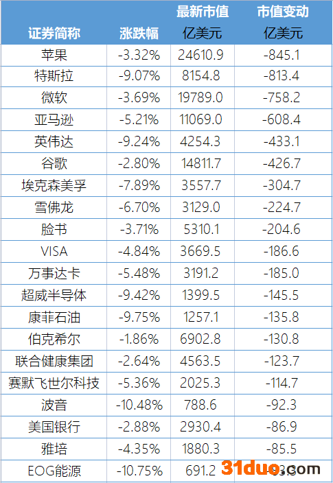 美股总计近7000家(6947家,不含OTC)上市公司,昨夜总市值损失高达2.1万亿美元,约合人民币14.18万亿元(离岸人民币即期汇率,6.7558,下同);其中标普500指数中损失最多的前20家公司就贡献了5989亿美元市值损失(约合人民币4万亿元)。