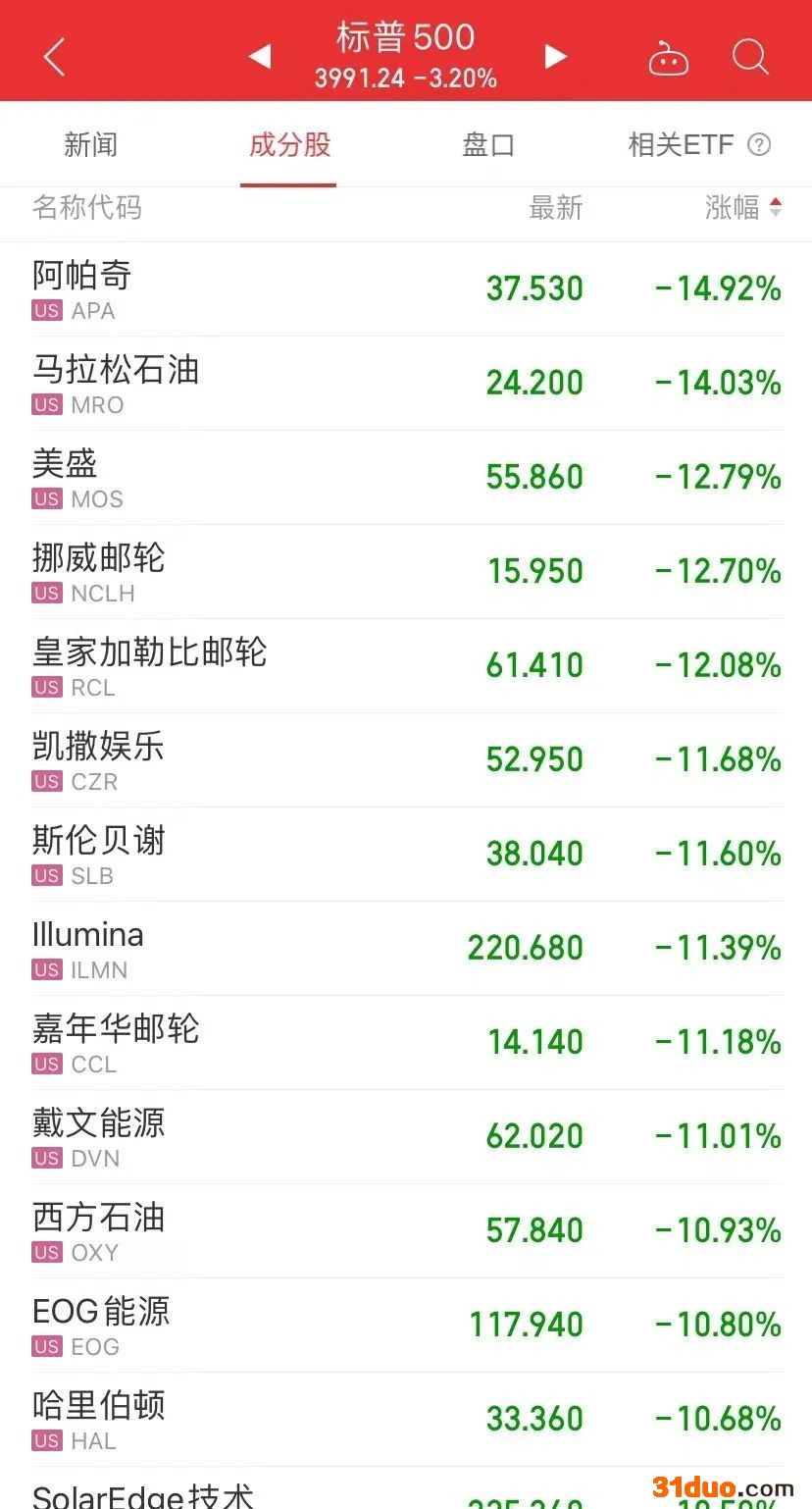 能源行业领头羊雪佛龙股价下跌6.7%,埃克森美孚跌7.85%,康菲石油跌9.75%,西方石油下跌了10.93%,马拉松石油跌超14.0%。