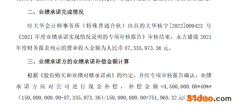 据悉,永吉盛珑2021年实现营业收入为8733.6万元,根据约定,业绩承诺方应对永吉盛珑进行现金补偿,补偿金额为75.2万元。