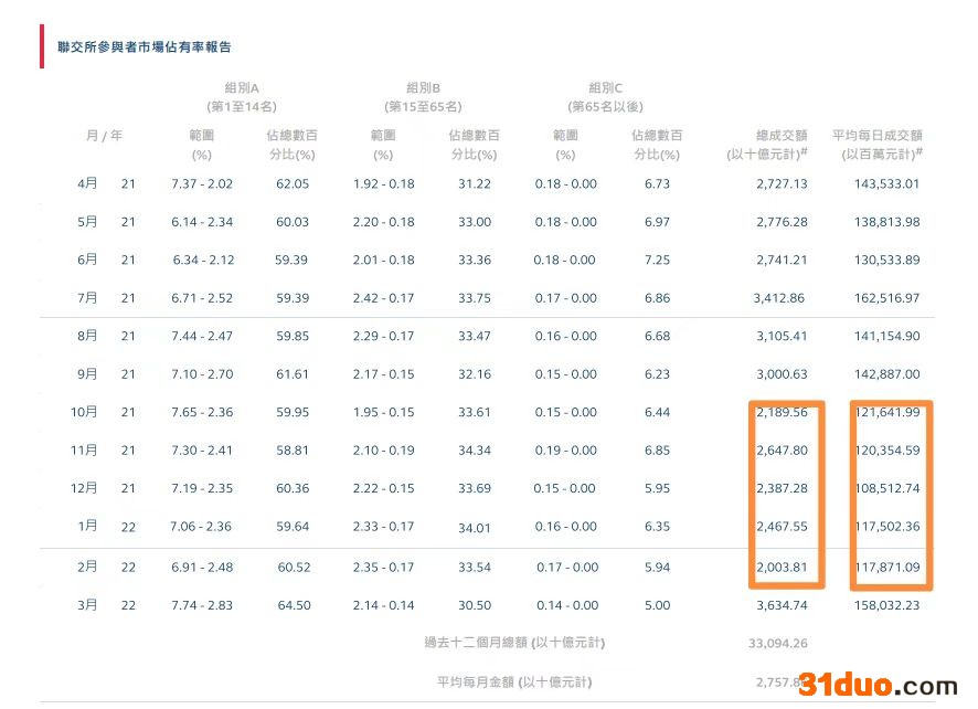 报告中,港交所参与者每月成交额与当月平均日成交额,在2021年10月至2022年2月,连续5个月呈现大比例下滑,这五个月的成交额均低于12个月总成交额平均值的2.7万亿,最低曾出现2月份的2万亿,最高为11月的2.6万亿。若以月度平均每日成交额数据观察,最低值出现在1月份的1085亿,最高值则为十月份的1216亿。而除这五个月外的其他月份中,每日平均成交额则在1305亿至1625亿之间。