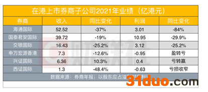 如果券商业有四季轮换,那么无论是背靠强大母公司的上市子公司,还是客户固化的中小券商,皆可以感受到冰冻三尺。根据财联社记者统计的2021年在港单独上市的中资券商海外子公司业绩,6家上市子公司除兴证国际外,收入同比均有20%-50%较大程度跌幅。