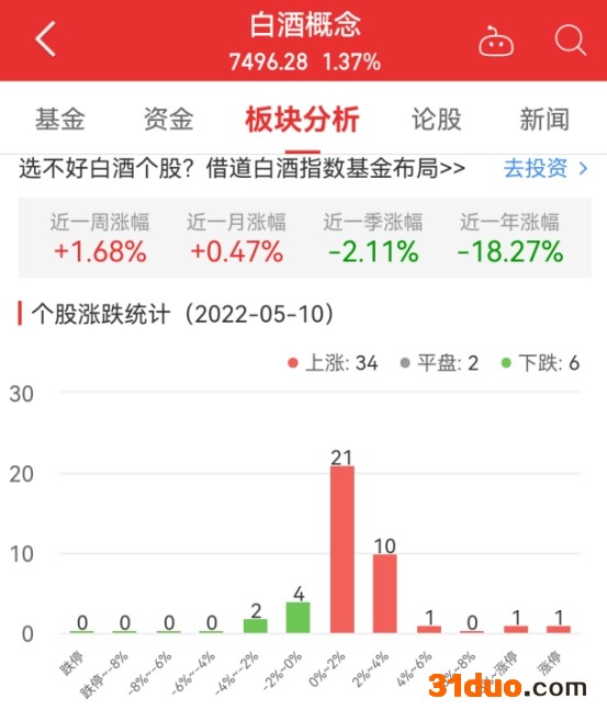 中国经济网北京5月10日讯 今日,白酒概念板块整体涨幅1.37%,其中34只股票上涨,2只股票平盘,6只股票下跌。