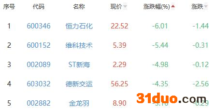 恒力石化、维科技术、ST新海、德新交运、金龙羽位列涨幅榜后五位,涨幅分别为-6.01%、-5.44%、-4.98%、-4.35%、-3.16%。