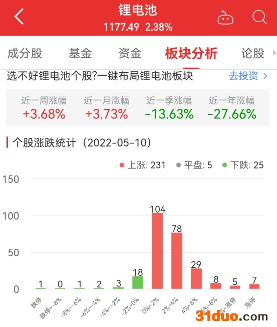 中国经济网北京5月10日讯 今日,锂电池板块整体涨幅2.38%,其中231只股票上涨,5只股票平盘,25只股票下跌。