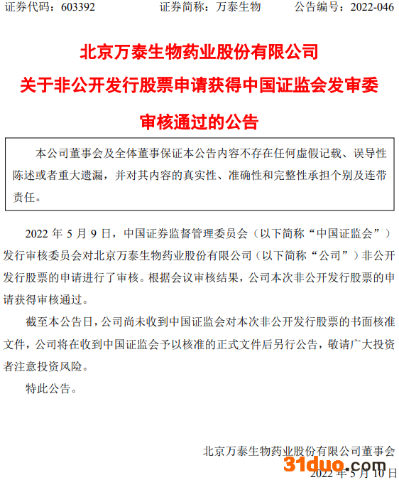 中国经济网北京5月10日讯 万泰生物(603392.SH)昨日晚间发布公告,公司非公开发行股票申请获得中国证监会发审委审核通过。今日,万泰生物股价低开高走,开跌0.34%,截至今日收盘,万泰生物报163.00元,涨幅2.18%,振幅4.31%,换手率0.80%,成交额2.84亿元,总市值1434.74亿元。
