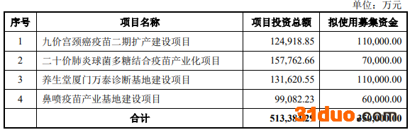 1.九价宫颈癌疫苗二期扩产建设项目,项目投资总额124,918.85万元,拟使用募集资金110,000.00万元;2.二十价肺炎球菌多糖结合疫苗产业化项目,项目投资总额157,762.66万元,拟使用募集资金70,000.00万元;3.养生堂厦门万泰诊断基地建设项目,项目投资总额131,620.55万元,拟使用募集资金110,000.00万元;4.鼻喷疫苗产业基地建设项目,项目投资总额99,082.23万元,拟使用募集资金60,000.00万元。