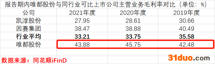 此外,报告期内,唯都股份主营业务毛利率均行业平均值,且逆势提升与行业相悖。2019年—2021年,唯都股份主营业务毛利率分别为42.48%、45.75%和43.88%。公司称,剔除社保减免的影响,2020年主营业务毛利率为41.53%,而同期可比公司平均值分别为35.58%、33.75%和33.21%,呈明显下滑。