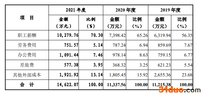而查看唯都股份主营业务成本构成,2019年其职工薪酬与其他外部成本占主营业务成本比例较大;2020年,国家对企业实施社保减免措施,唯都股份计入成本的社保减免金额为882.38万元,降低了公司的人工成本;2021年,社保减免措施取消,人工成本再次上升,且职工薪酬持续上涨。
