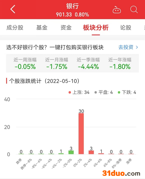 中国经济网北京5月10日讯 今日,银行板块整体涨幅0.80%,其中34只股票上涨,4只股票平盘,4只股票下跌。