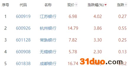 其中,江苏银行、杭州银行、常熟银行、无锡银行、成都银行位列板块涨幅榜前五位,涨幅分别为4.02%、3.86%、3.30%、2.30%、1.95%。