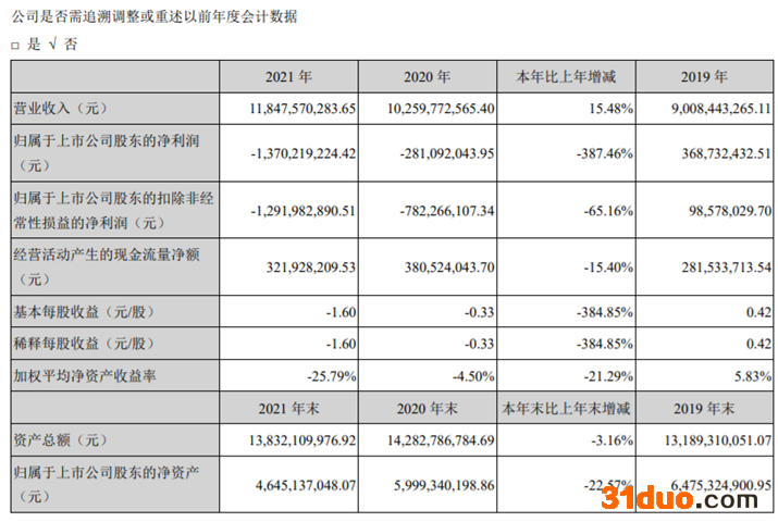 2021年,南都电源实现营业收入118.48亿元,同比增长15.48%;归属于上市公司股东的净利润-13.70亿元,同比下滑387.46%;归属于上市公司股东的扣除非经常性损益的净利润-12.92亿元,同比下滑65.16%;经营活动产生的现金流量净额为3.22亿元,同比下滑15.40%。