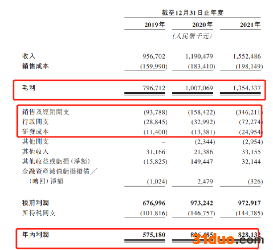 公司业绩来看,巨子生物2019年至2021年分别实现收入9.57亿元11.91亿元以及15.53亿元。公司毛利率超80%,且持续攀升,三年同期,公司毛利分别实现7.97亿元、10.07亿元以及13.54亿元,毛利率分别为83.28%、84.59%以及87.24%。