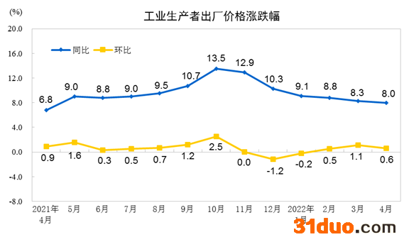 据国家统计局消息,2022年4月份,全国工业生产者出厂价格同比上涨8.0%,环比上涨0.6%;工业生产者购进价格同比上涨10.8%,环比上