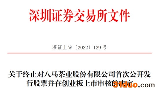 中国经济网北京5月11日讯 据深圳证券交易所官网消息,深圳证券交易所决定终止八马茶业股份有限公司(以下简称“八马茶业”)首次公开发行股票并在创业板上市审核。