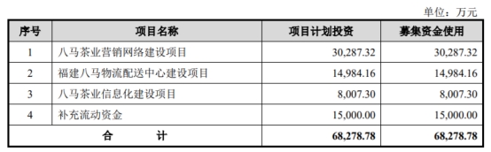 八马茶业本次公开发行新股数量不超过2580.00万股,占本次发行后总股本比例不低于25%,本次发行不涉及股东公开发售股份的情形。八马茶业原拟募集资金6.83亿元,计划用于八马茶业营销网络建设项目、福建八马物流配送中心建设项目、八马茶业信息化建设项目、补充流动资金。