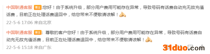 5月10日下午,中国联通官方微博发布消息称,近日,中国联通关注到有关媒体对5月6日由于系统升级导致部分用户被异常扣费相关事宜的报道。现将有关处置工作的进展情况说明如下。