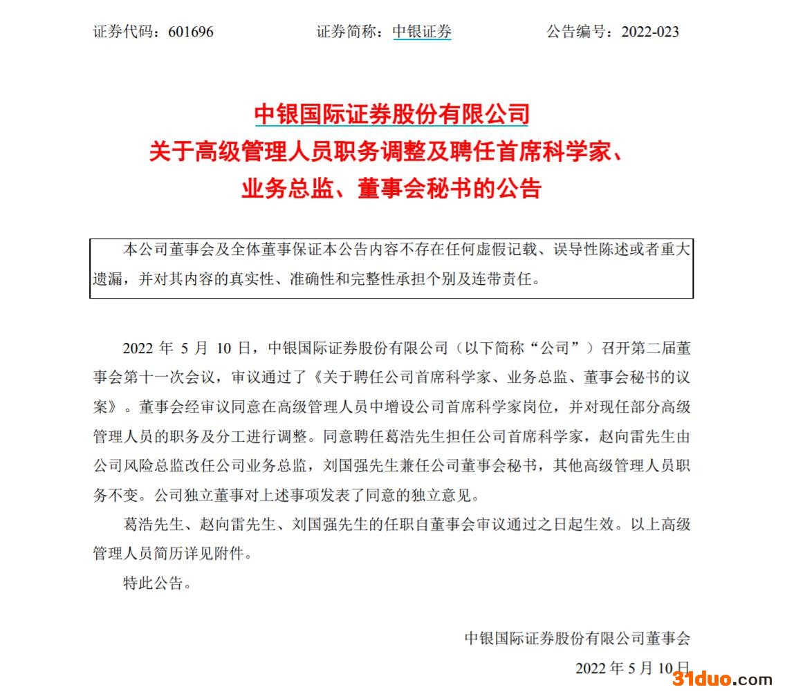 10日晚间,中银证券发布公告称,当天审议通过议案,董事会同意在高级管理人员中增设公司首席科学家岗位,并对现任部分高级管理人员的职务及分工进行调整。同意聘任葛浩担任公司首席科学家,赵向雷由公司风险总监改任公司业务总监,刘国强兼任公司董事会秘书,其他高级管理人员职务不变。