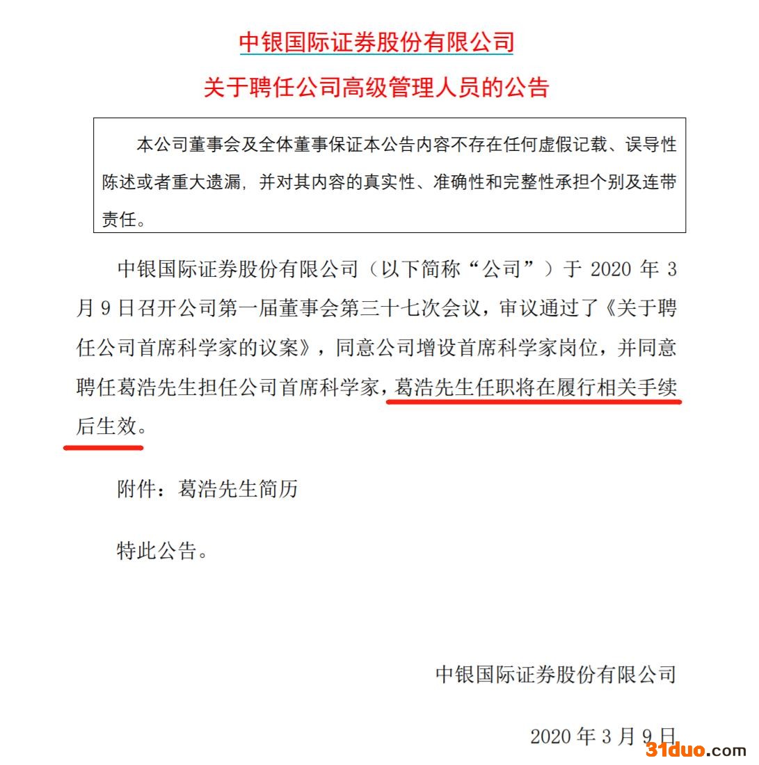 值得一提的是,早在2020年1月葛浩加入中银证券后,当年3月9日晚间,中银证券就发布聘任高管的公告称,将聘任葛浩担任首席科学家,其任职将在履行相关手续后生效。