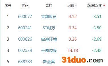 宋都股份、ST时万、启迪环境、云图控股、新益昌位列涨幅榜后五位,涨幅分别为-3.51%、-3.30%、-2.69%、-2.48%、-2.30%。