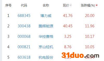 其中,博力威、鹏辉能源、华控赛格、京山轻机、杭电股份位列板块涨幅前五位,涨幅分别为20.00%、11.96%、10.17%、10.05%、10.04%。