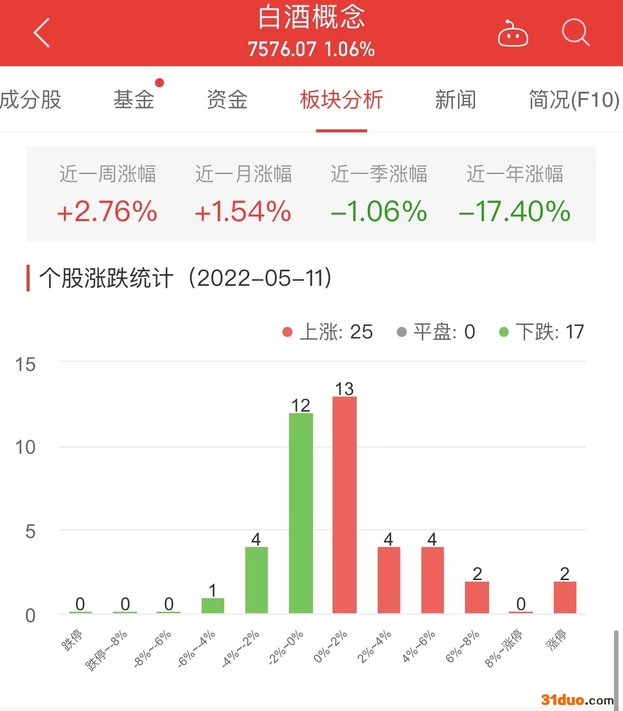 中国经济网北京5月11日讯 今日,白酒概念板块整体涨幅1.06%,其中25只股票上涨,0只股票平盘,17只股票下跌。