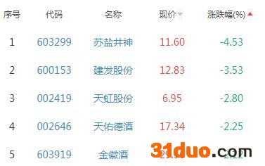 苏盐井神、建发股份、天虹股份、天佑德酒、金徽酒位列涨幅榜后五位,涨幅分别为-4.53%、-3.53%、-2.80%、-2.25%、-2.12%。