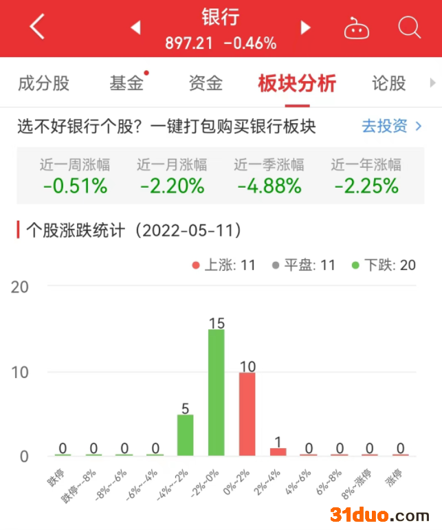 中国经济网北京5月11日讯 今日,银行板块整体跌幅0.46%,其中,11只股票上涨,11只股票平盘,20只股票下跌。